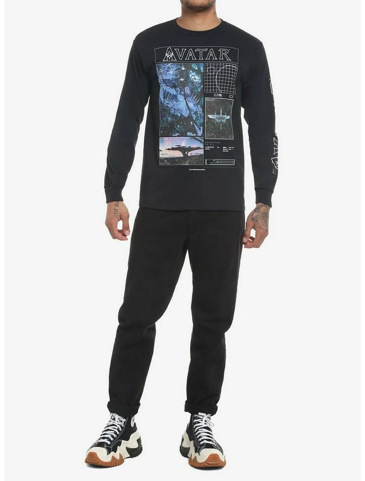 Β A new Avatar is coming. Expand your merch collection with this long-sleeve featuring different scenes from the planet of Pandora, along with coordinates and data, and the Avatar film logo.