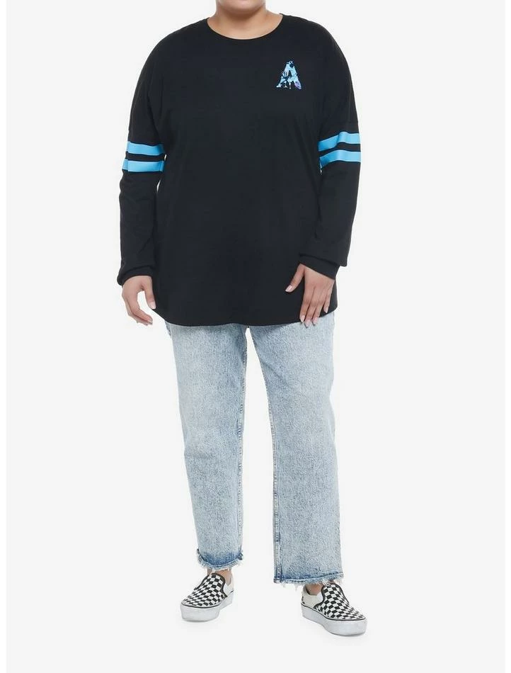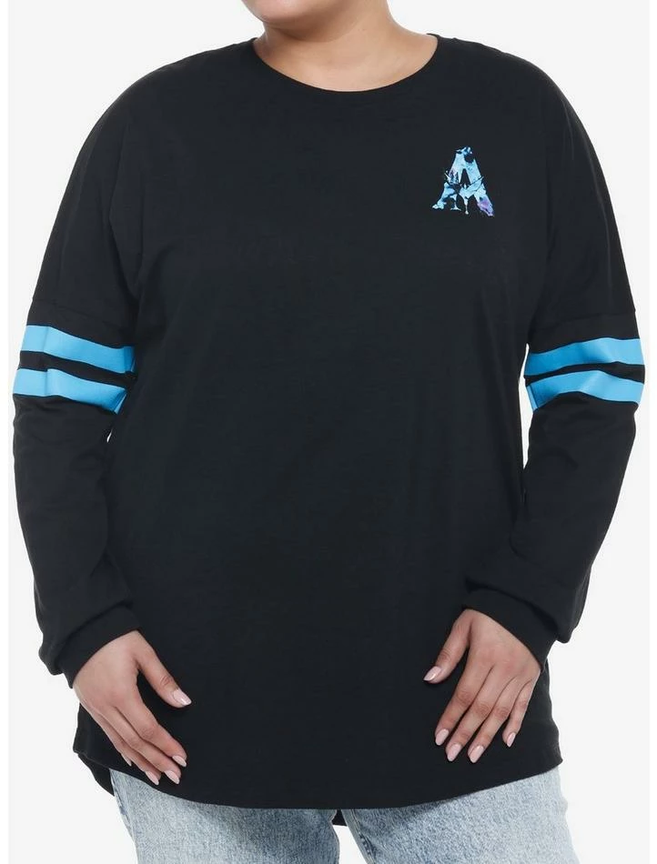 Rep the beautiful world of Pandora with this athletic jersey fromΒ Avatar: The Way of Water. It features blue varsity stripes on the sleeves and a watercolor print of the film’s “A” logo at the chest. The back depicts a silhouette of a Toruk soaring through the night sky.