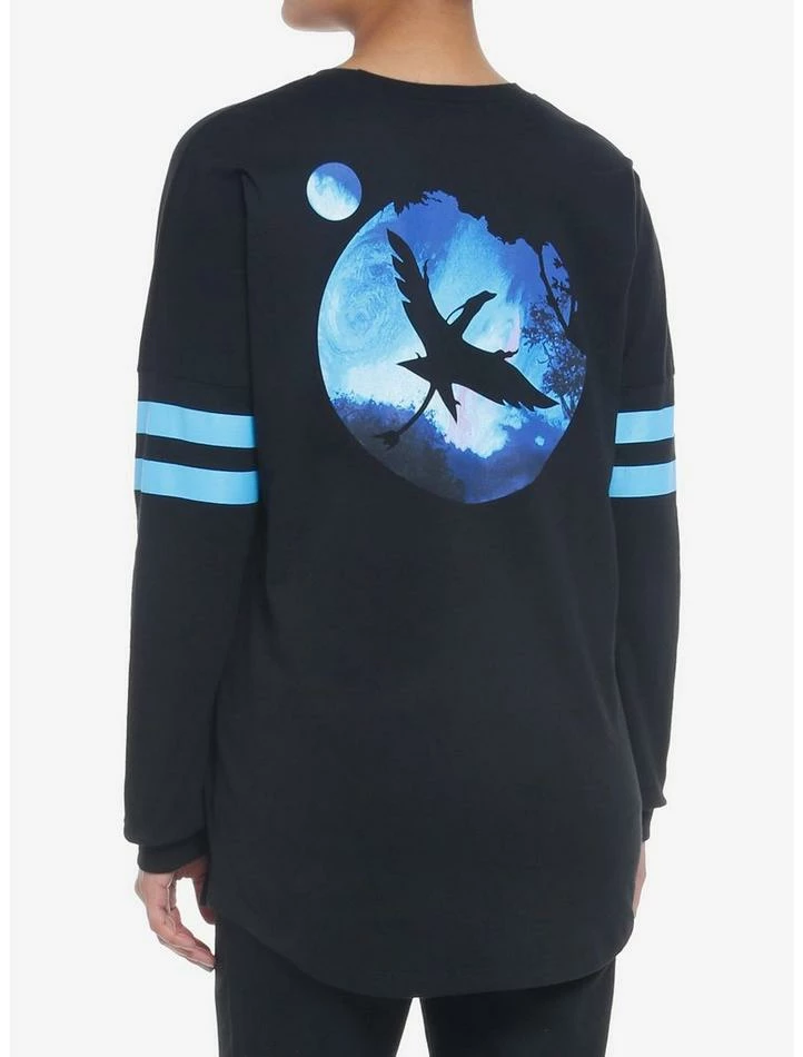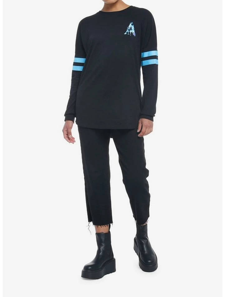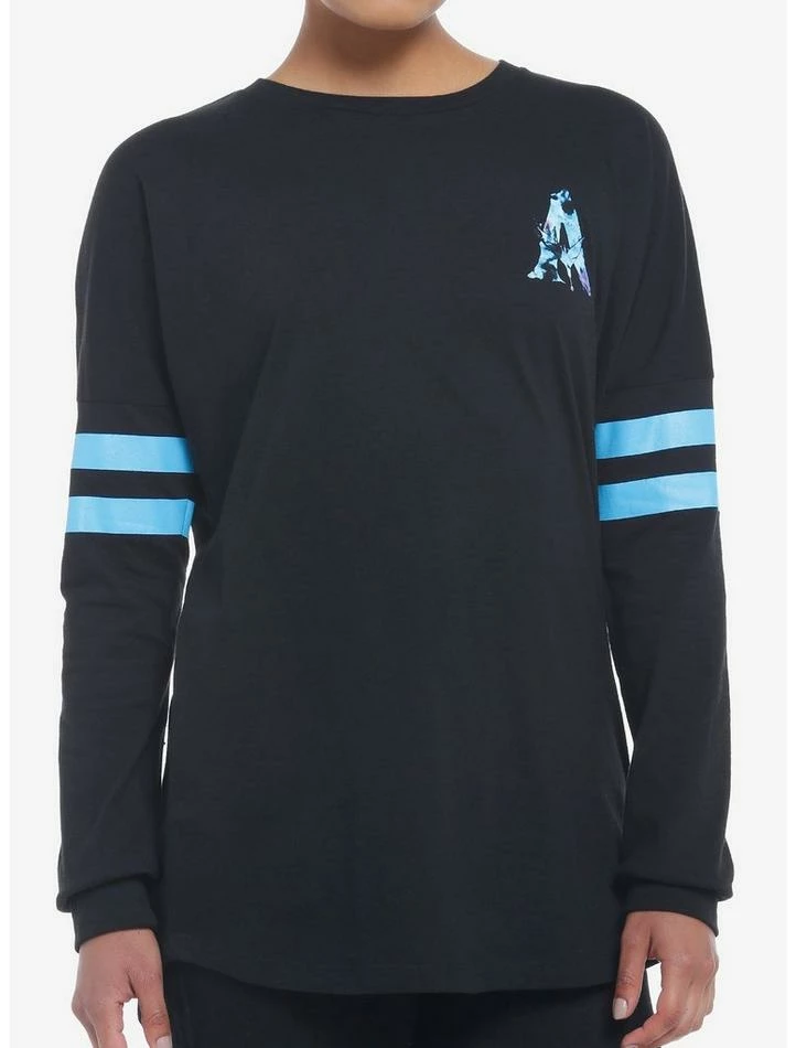 Rep the beautiful world of Pandora with this athletic jersey from Avatar: The Way of Water. It features blue varsity stripes on the sleeves and a watercolor print of the film’s “A” logo at the chest. The back depicts a silhouette of a Toruk soaring through the night sky.