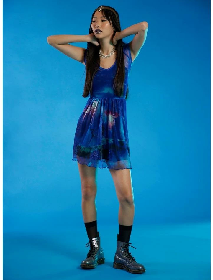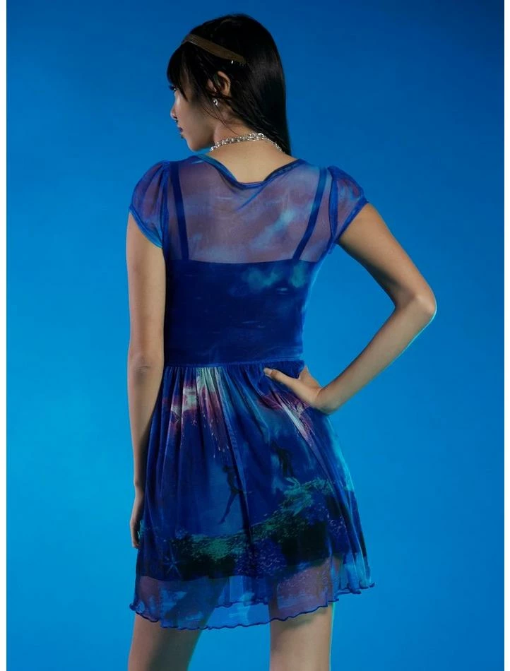 Delve deeper into the world of Pandora! From Avatar: The Way of Water, this mesh dress depicts a beautiful scene of Na’vi enjoying themselves among the planet’s rich landscape. Comes with a lettuce hem and a cami dress underneath the mesh layer.